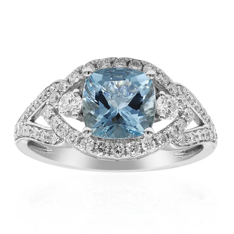 Entdecken Sie die ruhige Eleganz dieses Rings aus 14 Karat Weißgold mit einem brasilianischen Aquamarin im AAA-Qualitäts-Kissenschliff und einem Gewicht von 1,41 Karat in der Mitte. Flankiert von 50 Diamanten der Reinheit SI2 mit einem Gesamtgewicht von 0,55 ct, glänzt dieses luxuriöse Schmuckstück mit zeitloser Brillanz. Es ist ideal für anspruchsvolle Abendveranstaltungen oder als unverwechselbares Schmuckstück, das jedem Outfit einen Hauch von Klasse verleiht.