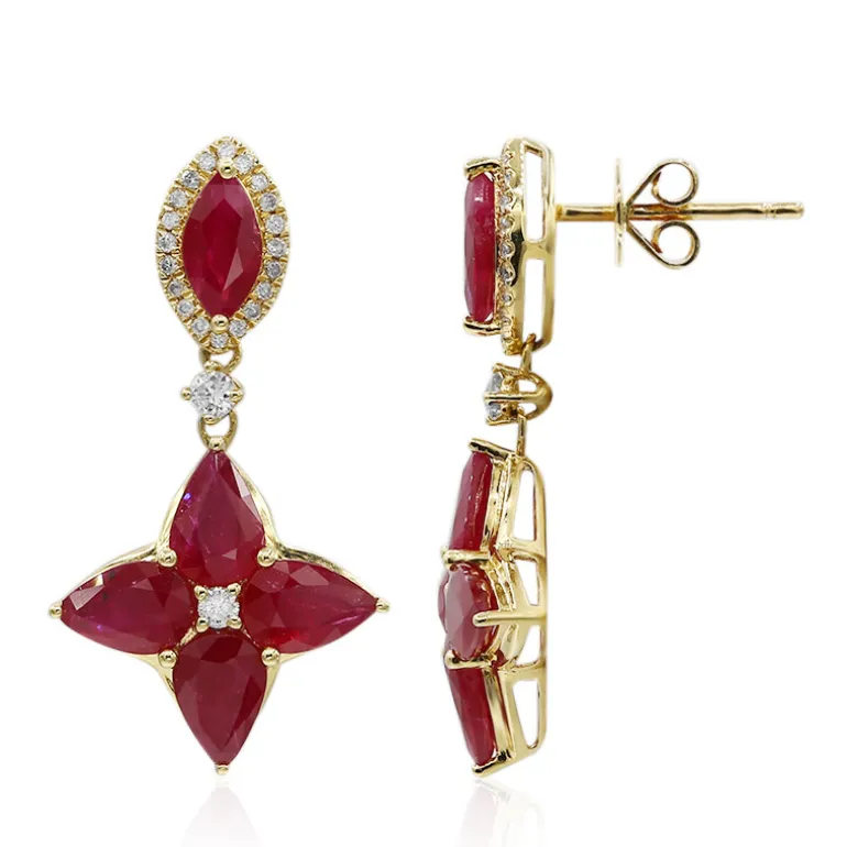 Entdecken Sie die Opulenz dieser Ohrringe aus 18 Karat Gelbgold, bei denen luxuriöse AAA-Rubine aus Mosambik im Mittelpunkt stehen, die von glitzernden Diamanten von insgesamt 0,215 Karat akzentuiert werden. Mit einem Gesamtkaratgewicht von 4,855 Karat strahlen die elegant geformten Rubine im Marquise- und Teardrop-Schliff einen satten, tiefroten Farbton aus, der die Essenz der Romantik einfängt. Diese Ohrringe eignen sich perfekt für eine Gala oder eine bedeutende Feier und verleihen jeder Abendgarderobe einen Hauch von Grandezza. Das CIRARI-Design garantiert Exklusivität und tadellose Handwerkskunst.