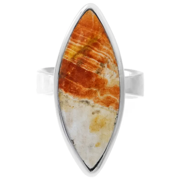 Beleben Sie Ihren Stil mit den leuchtenden Farben eines Sunset-Jaspis, der in einem Marquise-Schliff gefasst ist und die warmen Töne eines indonesischen Sonnenuntergangs einfängt. Dieser 9-karätige Edelstein ist elegant in einen Marquise-Cabochon eingefasst, der durch den Glanz von platiniertem 925er Sterlingsilber akzentuiert wird. Mit seiner erdigen Farbgebung passt dieser Ring sowohl zur Tagesgarderobe als auch zur Abendgarderobe. Er ist ein Schatz für Sammler oder ein großartiges Geschenk und bringt die Schönheit der Natur an Ihren Finger.