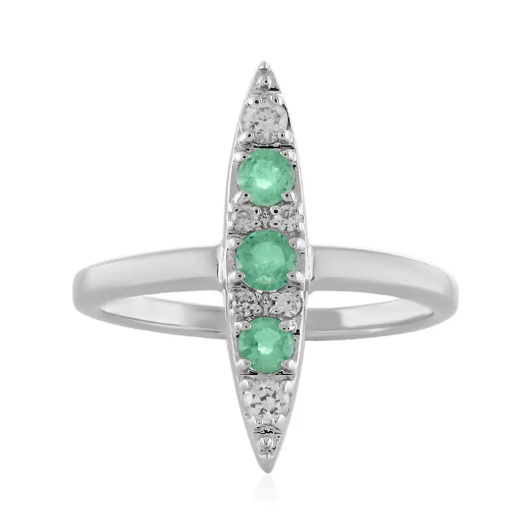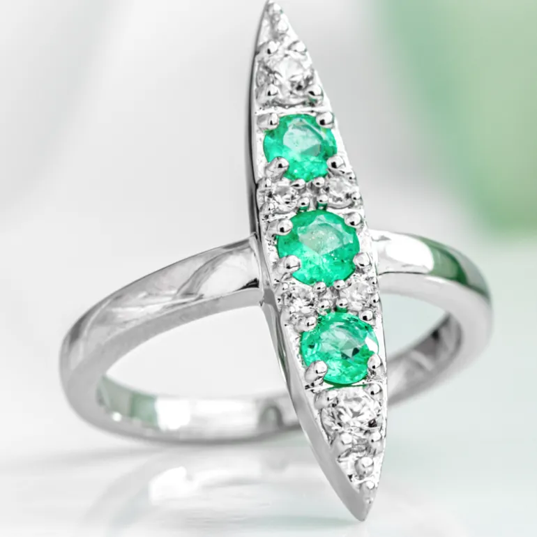 Entdecken Sie die Faszination dieses eleganten Rings mit dem grünen Charme äthiopischer Smaragde, die von funkelnden Zirkonen aus Kambodscha ergänzt werden. Der Edelstein mit einem Gesamtgewicht von 0,712 Karat ist in ein platiniertes 925er Sterlingsilberband eingefasst, das Langlebigkeit und einen Hauch von Brillanz verspricht. Der Ring ist ideal, um einen farbigen Akzent im Alltag zu setzen oder ein besonderes Schmuckstück für besondere Anlässe. Das moderne Design dieses Rings passt sowohl zu eleganter als auch zu formeller Kleidung.