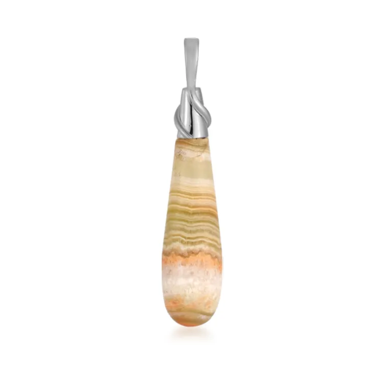 Dieser auffällige Anhänger präsentiert die ruhige Schönheit des mexikanischen Alabaster-Calcits mit einem großen Edelstein im Briolett-Schliff von 20 Karat. Der Anhänger aus platiniertem 925er Sterlingsilber ist vom balinesischen Barong inspiriert, einem Symbol des Schutzes. Seine exquisiten Erdtöne und der sanfte Farbverlauf machen ihn zu einem ätherischen Accessoire, das sich sowohl für die Freizeit als auch für elegante Anlässe eignet. Kombinieren Sie ihn mit einem hochgeschlossenen Pullover oder einem Cocktailkleid, um ein unaufdringliches, aber fesselndes Statement zu setzen.