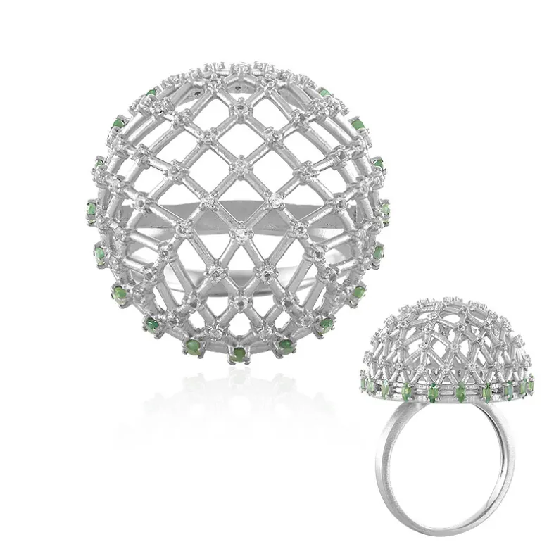 Tauchen Sie ein in den fesselnden Charme dieses kuppelförmigen Rings, der mit 20 indischen Alexandriten im Marquiseschliff von insgesamt 0,567 ct. besetzt ist und von 61 funkelnden weißen Topasen aus Madagaskar im Rundschliff mit einem Gesamtgewicht von 0,502 ct. akzentuiert wird. Dieses exquisite Schmuckstück aus 925er Sterlingsilber mit einer hochwertigen Platinbeschichtung wiegt ca. 7,97 g und bietet einen luxuriösen und bequemen Sitz. Der Gitterrahmen und die grünen Edelsteine bilden eine harmonische Symphonie aus Design und Farbe und machen ihn zu einer großartigen Wahl für Abendveranstaltungen oder zu einem raffinierten Accessoire für jeden Tag. Heben Sie Ihren Stil mit dieser elegant strukturierten und verführerischen Ergänzung Ihrer Kollektion auf ein neues Niveau.