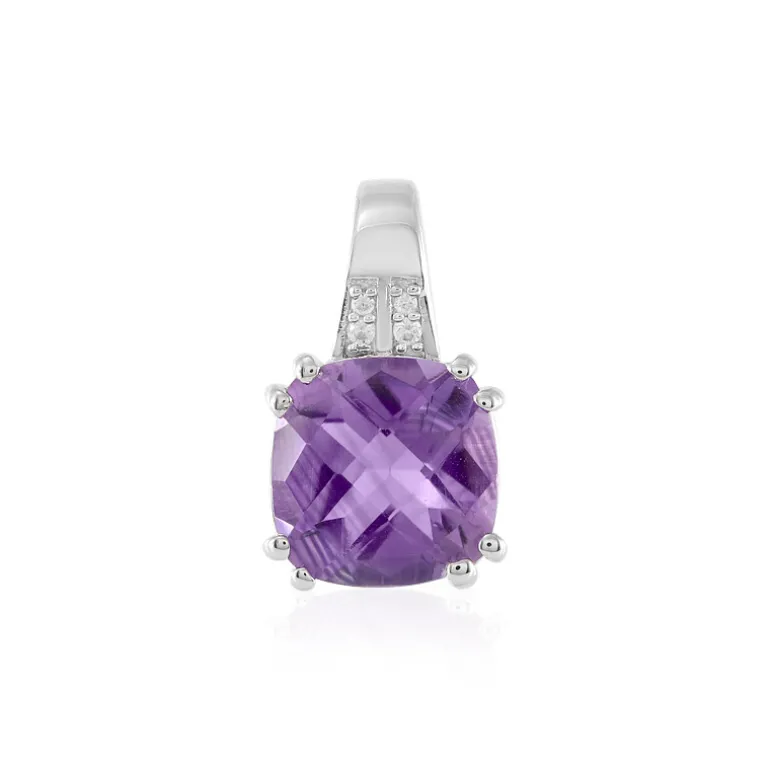 Dieser atemberaubende 3,38-karätige Amethyst-Anhänger mit elegantem Kissen-Schachbrett-Schliff ist eine Kostbarkeit aus Brasilien. Er ist wunderschön in 925er Sterlingsilber eingefasst und mit funkelnden kambodschanischen Zirkonsteinen von insgesamt 0,037 Karat besetzt. Mit einer Größe von ca. 10 mm ist der Amethyst mit seinem königlichen violetten Farbton ein echtes Schmuckstück. Sein zeitloses Design ist ideal für Abendveranstaltungen oder als raffinierter Akzent für Geschäftskleidung und verspricht eine bezaubernde Ergänzung für jede Schmucksammlung zu sein.