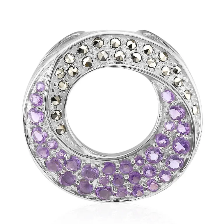 Entdecken Sie den faszinierenden Charme dieses Anhängers aus Sterlingsilber mit einer Kollektion brasilianischer Amethyste von insgesamt 1,56 Karat, die meisterhaft geschliffen wurden, um ihren violetten Farbton und ihre Brillanz zu maximieren. Ergänzt durch das subtile Funkeln österreichischer Markasitsteine strahlt dieser Anhänger Vintage-Eleganz mit einem modernen Touch aus. Das runde Design mit einem Gewicht von 4,8 g Silber verleiht Ihrem Ensemble einen einzigartigen Stil und macht ihn zu einem perfekten Accessoire für legere und formelle Anlässe.