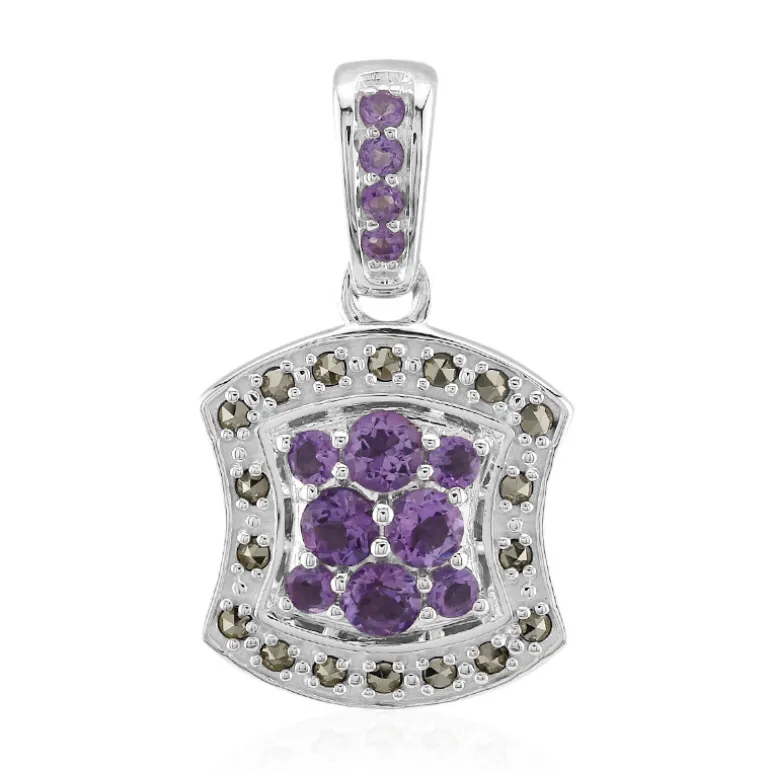 Lassen Sie sich vom Charme dieses schicken Anhängers verzaubern, der eine Harmonie aus brasilianischen Amethysten von insgesamt 0,768 Karat aufweist. Jeder Edelstein ist sorgfältig rund geschliffen, um seinen satten violetten Farbton zu betonen, ergänzt durch eine Reihe funkelnder Marcasite aus Rumänien. Das elegante Accessoire ist in hochwertiges 925er Sterlingsilber gefasst, wiegt etwa 2,6 Gramm und hat eine Anhängergröße von 24×14 mm. Er ist ideal, um jedem Outfit einen Hauch von Raffinesse zu verleihen und eignet sich sowohl für den Übergang zwischen Tag und Nacht als auch für besondere Anlässe. Sein zeitloses Design sorgt dafür, dass er zu einem beliebten Stück in Ihrer Sammlung wird.