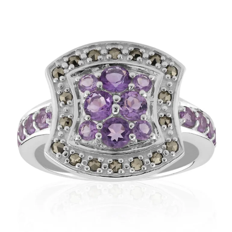 Entdecken Sie die Anziehungskraft dieses raffinierten Rings, der mit einer prächtigen Reihe brasilianischer Amethysten von insgesamt 0,4 Karat besetzt ist, die von 0,36 Karat funkelnden Amethysten ergänzt werden. Eingefasst in hochwertiges 925er Sterlingsilber und akzentuiert durch 0,18 ct glitzernden Markasit aus Rumänien, versprüht dieses Stück Charme. Mit einer Größe von 21×20 mm ist dieser Ring ein Zeugnis zeitloser Eleganz. Er eignet sich perfekt, um Ihrer Freizeitgarderobe einen farblichen Akzent zu verleihen oder Ihre Abendgarderobe aufzuwerten und wird mit Sicherheit ein beliebtes Stück in Ihrer Sammlung werden.