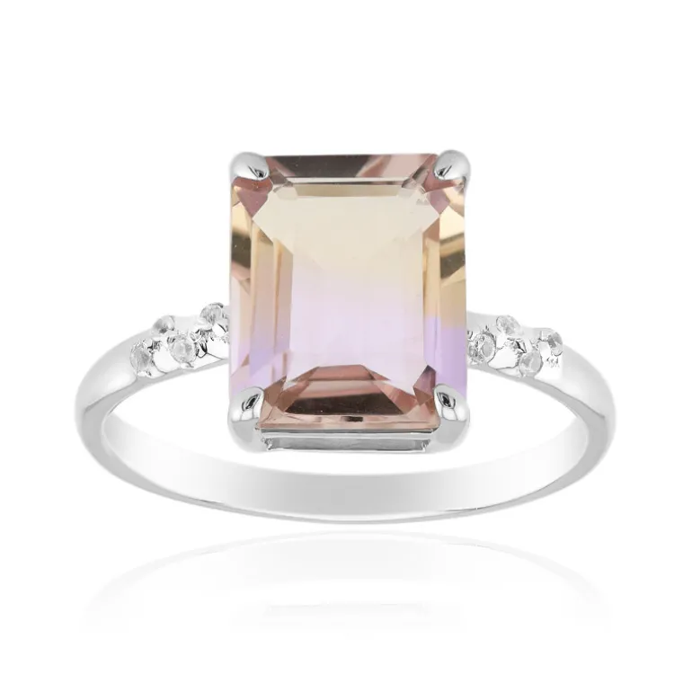 Dieser exquisite Ring zeigt einen atemberaubenden bolivianischen Ametrin, der fachmännisch im Stil einer achteckigen Treppe geschliffen wurde, um seine einzigartige Farbmischung zu enthüllen. Ergänzt durch kambodschanische Zirkon-Akzente, strahlt dieses Stück Eleganz aus. Gefertigt aus platiniertem 925er Sterlingsilber, bietet es einen raffinierten Glanz. Perfekt für formelle Anlässe oder als eleganter Akzent im Alltag.