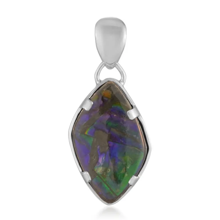 Entdecken Sie die Pracht dieses bezaubernden Ammolith-Anhängers, gefasst in 925er Sterlingsilber. Der aus Kanada stammende Stein im Fantasieschliff hat ein beeindruckendes Gewicht von 11,25 Karat und bildet ein auffälliges Herzstück. Dieser Anhänger eignet sich sowohl für legere als auch für formelle Anlässe und verleiht jedem Outfit einen eleganten Touch. Kombinieren Sie ihn mit einer schlichten Kette, um seine einzigartigen Farben richtig zur Geltung zu bringen.