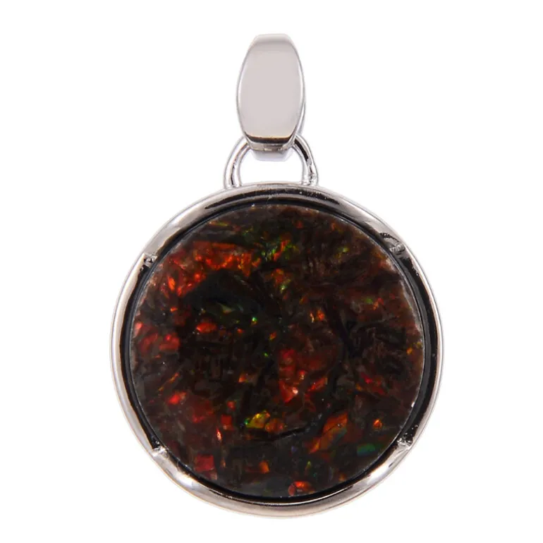 Entdecken Sie das Kaleidoskop der leuchtenden Farben dieses exquisiten Anhängers mit einem runden Cabochon aus kanadischem Ammolith von 6,2 Karat. Die Fassung aus 925er Sterlingsilber verleiht ihm einen zeitlosen Charakter und unterstreicht die natürliche Schönheit des Edelsteins. Stellen Sie sich dieses Schmuckstück als Statement-Accessoire vor, das sich nahtlos vom lässigen Tagesoutfit bis hin zu einem Hauch von Opulenz für Ihre Abendgarderobe eignet. Dieser Anhänger ist ideal für Sammler oder alle, die ihrer Schmucksammlung eine einzigartige Note verleihen möchten, denn er besticht durch seine feurigen, schillernden Farben.