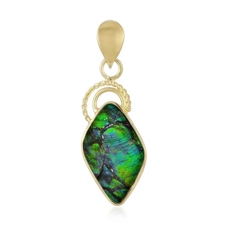 Entdecken Sie die bezaubernde Schönheit des Ammolite Gold-Plated Silver Anhängers. Der exquisite 11,25 Karat schwere Ammolith-Edelstein aus Kanada ist in 925er Sterlingsilber mit einer luxuriösen Goldplattierung gefasst. Sein einzigartiger Fancy-Schliff und seine leuchtenden Farben machen ihn zu einem außergewöhnlichen Schmuckstück. Dieser Anhänger ist ideal, um sowohl legere als auch formelle Kleidung mit einem Hauch von Eleganz zu versehen und ist ein Muss für jeden Schmuckliebhaber.
