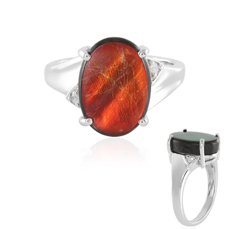 Dieser auffällige Ring präsentiert einen fesselnden Ammolith aus Madagaskar mit einem Ovalschliff von 5,22 Karat, der für sein lebhaftes Farbspiel geschätzt wird. Eingerahmt von zwei funkelnden weißen Topasen im Rundschliff aus Indien, sitzt das exquisite Mittelstück in einem hochwertigen 925er Sterlingsilberband. Die warmen Farbtöne des Ammoliths machen diesen Ring zu einem idealen Accessoire für herbstliche Outfits oder um schlichteren Kleidern einen Hauch von Farbe zu verleihen. Ein wirklich einzigartiges Stück, das sowohl für Gesprächsstoff sorgt als auch die Schönheit natürlicher Edelsteine unterstreicht.