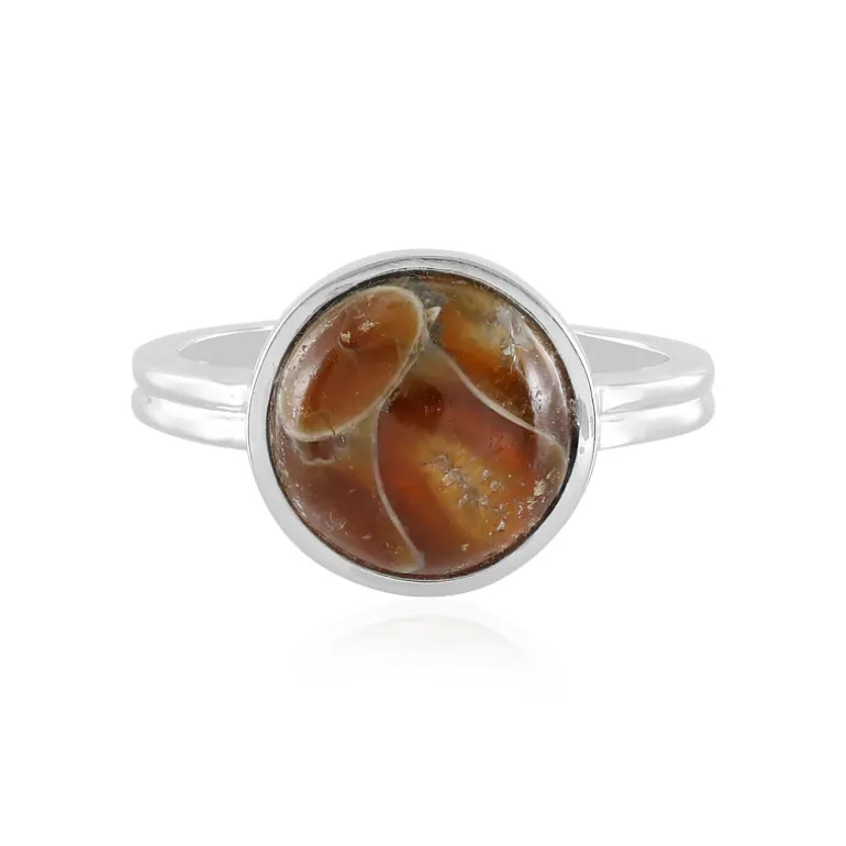 Entdecken Sie den Zauber der Geschichte mit diesem bezaubernden Ammonitenring aus Madagaskar. Der makellose, runde Cabochon-Edelstein mit einem Gewicht von 3,5 Karat strahlt einen warmen, erdigen Farbton aus, der eine Millionen Jahre alte Geschichte erzählt. Die Fassung aus 925er Sterlingsilber verleiht dem Fossil einen modernen Touch und rahmt es anmutig ein. Er eignet sich sowohl für zwanglose Brunchs als auch für elegante Abende und verkörpert zeitlose Eleganz für den anspruchsvollen Sammler.