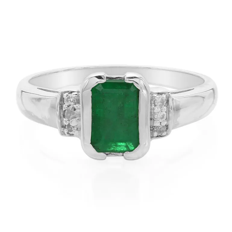 Entdecken Sie zeitlose Eleganz mit diesem Bahia-Smaragdring, der einen lebhaften 0,77-karätigen Edelstein im Achteckschliff aus Brasilien enthält. Umgeben von sechs schillernden Zirkonen aus Kambodscha, ist dieser Ring aus 925er Sterlingsilber fachmännisch plattiert für dauerhaften Glanz. Perfekt für formelle und legere Anlässe, ergänzt dieses exquisite Stück mühelos jedes Outfit und verleiht Ihrem Look einen Hauch von raffiniertem Charme.