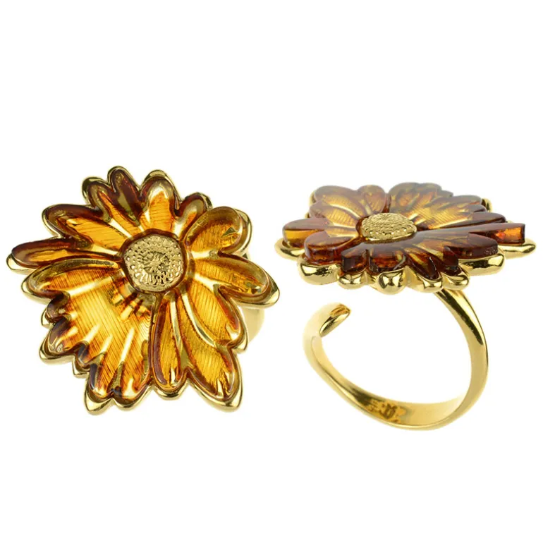 Lassen Sie sich von der Wärme und Ausstrahlung dieses sorgfältig gefertigten Rings mit einem exquisiten Blumendesign verzaubern, das mit poliertem baltischem Bernstein aus Polen besetzt ist. Jedes Bernsteinblatt mit insgesamt 3,35 Karat fängt mit seinen ausgefallen geschliffenen Facetten die Sonne ein und ist in glänzendes, vergoldetes 925er Sterlingsilber gefasst. Mit einer Größe von ca. 26×29 mm blüht dieses Schmuckstück an Ihrem Finger auf und verleiht sowohl legeren als auch formellen Anlässen einen lebendigen Touch. Es ist ein zeitloses Accessoire, das in jeder Schmucksammlung einen Ehrenplatz einnehmen wird.