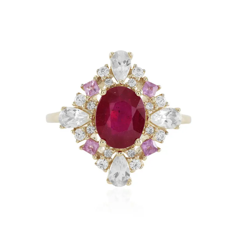 Entdecken Sie die königliche Anziehungskraft dieses luxuriösen Rings aus 9 Karat Gelbgold, gekrönt von einem majestätischen Madagaskar-Bemainty-Rubin im Ovalschliff mit 2,323 Karat. Umgeben vom Schimmer tropfenförmiger kambodschanischer Zirkone und quadratischer rosafarbener Madagaskar-Saphire, strahlt das Herzstück mit einem Gesamtgewicht von 3,909 Karat. Das elegante Design zeugt von Raffinesse und ist die perfekte Wahl für Gala-Veranstaltungen oder um der Alltagskleidung einen Hauch von Pracht zu verleihen.