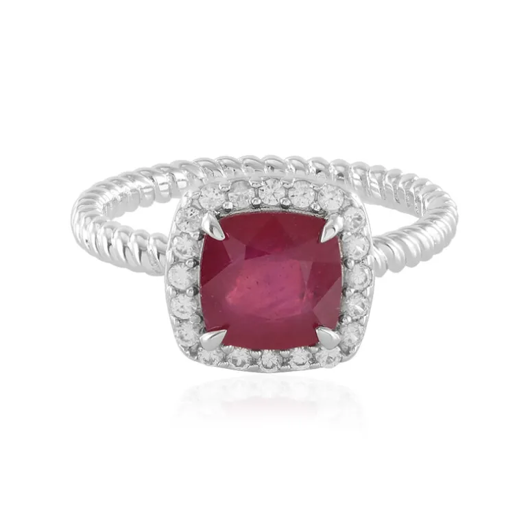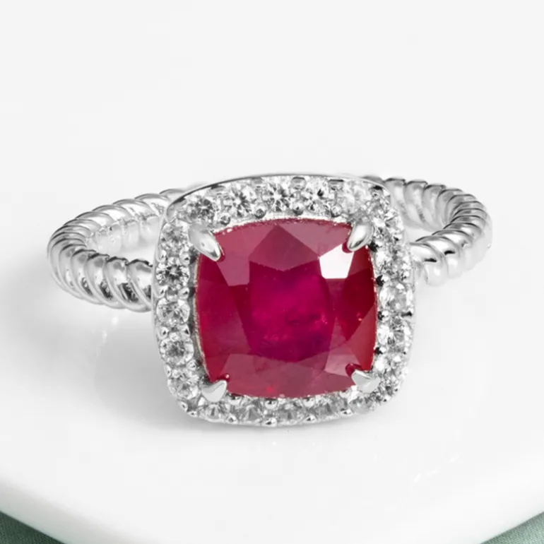Entdecken Sie die Faszination des Bemainty-Rubins aus Madagaskar, der im Kissenschliff geschliffen wurde, um seine karminrote Pracht zu enthüllen. Dieser Ring aus 925er Sterlingsilber, der für Langlebigkeit plattiert ist, enthält einen Rubin von 2,915 Karat in der Mitte, der von funkelnden Zirkonen von insgesamt 0,417 Karat aus Kambodscha umgeben ist. Das einzigartige gedrehte Band unterstreicht die Eleganz des Rings. Perfekt für die Abendgarderobe oder um Ihrem Alltagsoutfit einen Hauch von Eleganz zu verleihen.