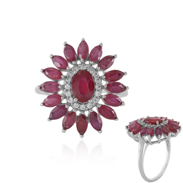 Entdecken Sie den Glanz Madagaskars mit diesem atemberaubenden Ring, der in der Mitte einen Bemainty-Rubin im Ovalschliff zeigt, der von Rubinen im Marquiseschliff in einem auffälligen Blumenmuster umgeben ist. Dieser Ring aus 925er Sterlingsilber mit Platinbeschichtung wird von einem kambodschanischen Zirkon akzentuiert, der für einen Hauch von Funkeln sorgt, und ist ebenso haltbar wie schön. Das Gesamtkaratgewicht von 4,038 ct sorgt für einen luxuriösen Auftritt an jeder Hand. Dieser Ring ist perfekt geeignet, um der Abendgarderobe einen Farbtupfer zu verleihen oder das Alltagsoutfit aufzuwerten und zeugt von der Pracht der charakteristischen Edelsteine aus Madagaskar.