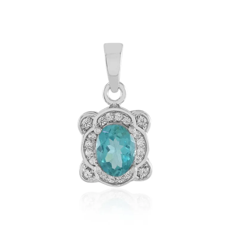 Entdecken Sie die bezaubernde Anziehungskraft dieses Anhängers mit einem zentralen ovalen brasilianischen blauen Apatit im Brillantschliff, umgeben von funkelnden kambodschanischen Zirkonen. Mit einem Edelsteingewicht von insgesamt 1,501 Karat versprüht dieses Stück Charme. Das 925er Sterlingsilber mit Platinbeschichtung bietet eine luxuriöse Grundlage und bringt die lebhaften blauen Farbtöne in einem 22×11 mm großen Design zur Geltung. Ob zu einem eleganten Abendkleid oder einem schicken Tagesoutfit, dieser Anhänger passt mit seinem anmutigen Stil zu jedem Anlass.