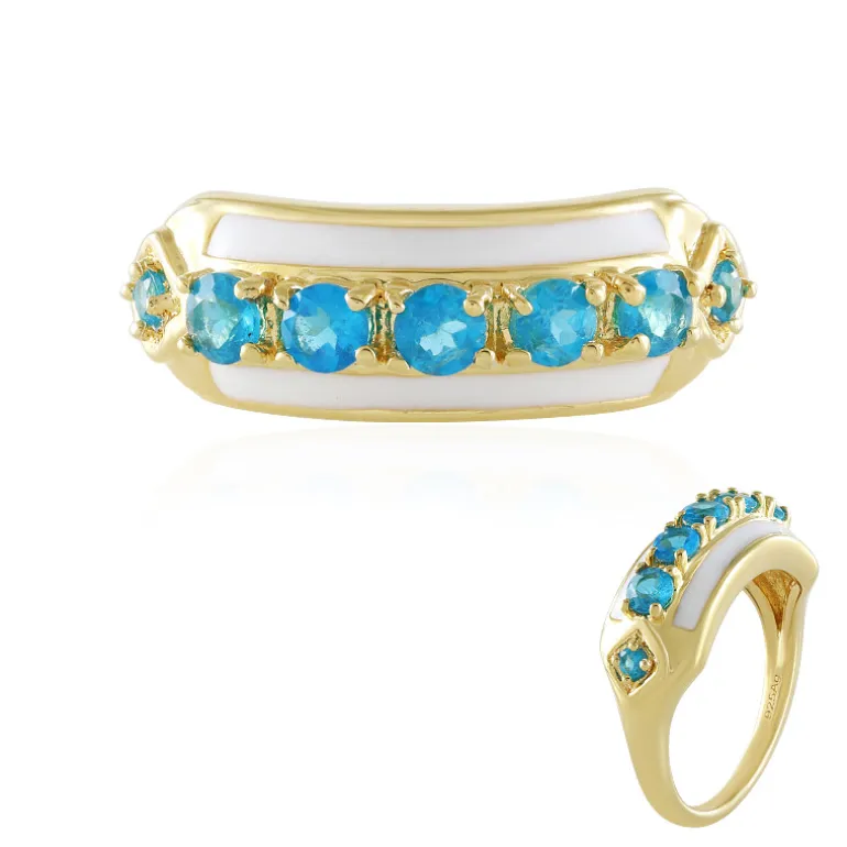Dieser bezaubernde Ring zeigt eine atemberaubende Kombination aus sieben blauen Apatiten aus Brasilien, gefasst in vergoldetem 925er Sterlingsilber. Mit einem Gesamtkaratgewicht von 0,594 ct werden die leuchtenden Blautöne perfekt durch die schimmernde Goldoberfläche ergänzt. Dieser Ring eignet sich sowohl für legere als auch für formelle Anlässe und verleiht jedem Outfit einen Hauch von Eleganz. Kombinieren Sie ihn mit einem schlichten Kleid, um seine Schönheit zur Geltung zu bringen.