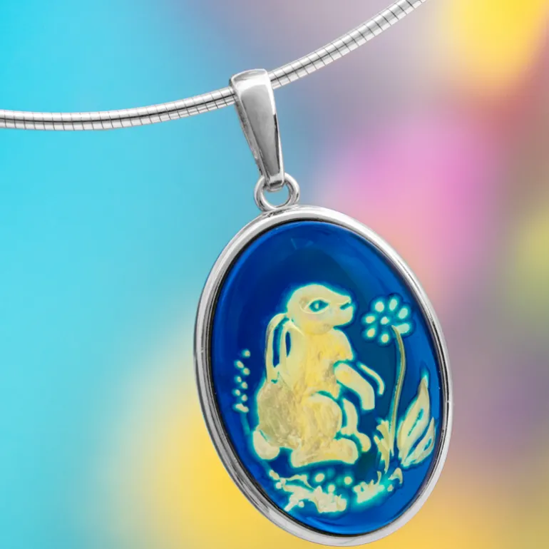 Der Anhänger Whimsical Blue Amber Bunny verleiht Ihrer Schmucksammlung eine charmante und verspielte Note. Mit einem 10-karätigen polnischen Bernstein, der in einem ovalen Cabochon geschnitzt ist, fesselt dieses Stück die Fantasie mit einem liebenswerten Hasen und einer Blumenszene. Der Anhänger ist in hochwertiges 925er Sterlingsilber gefasst und misst 41 x 22 mm, was ihn zu einer auffälligen Ergänzung für jedes Ensemble macht. Perfekt, um Ihrer Tages- oder Wochenendgarderobe einen Hauch von Farbe und Charakter zu verleihen, ist er nicht nur ein Accessoire, sondern auch ein Gesprächsanlass.