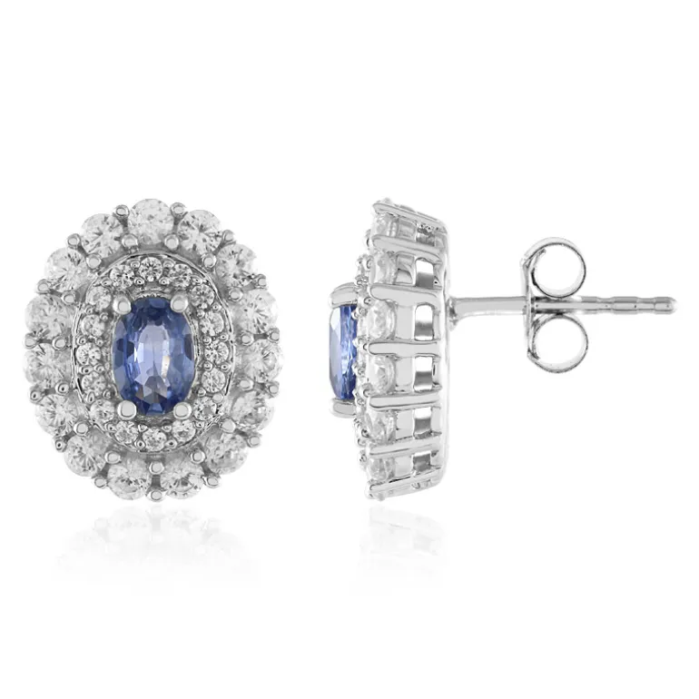 Entdecken Sie die Eleganz der Ceylon Sapphire Silver Earrings mit zwei schillernden Ceylon Saphiren im Ovalschliff, die von einer Reihe funkelnder kambodschanischer Zirkone umhüllt sind. Diese 15 mm großen Ohrringe sind aus platiniertem 925er Sterlingsilber gefertigt und verleihen jedem Ensemble einen raffinierten Touch. Perfekt, um die Abendgarderobe aufzuwerten oder besonderen Anlässen einen raffinierten Glanz zu verleihen.