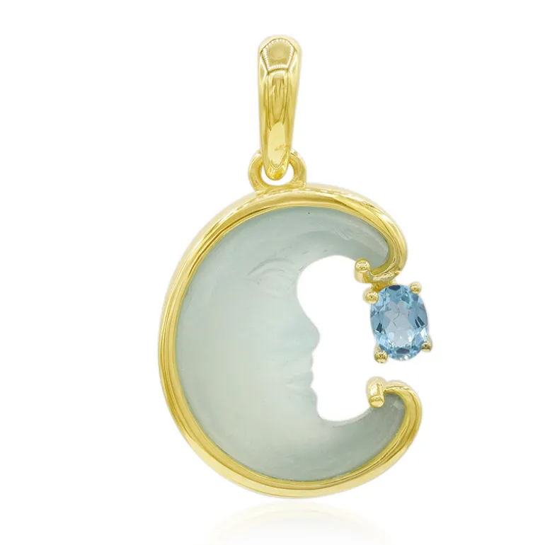 Dieser bezaubernde Anhänger aus 9 Karat Gelbgold besticht durch einen brasilianischen blauen Chalzedon im einzigartigen Moonface-Schliff mit einem Gewicht von 3,664 Karat. Ergänzt wird er durch einen Schweizer Blautopas von 0,179 Karat. Die glänzende Goldfassung wiegt etwa 2,74 Gramm und macht ihn zu einem Stück in Erbstückqualität. Dieses Schmuckstück eignet sich perfekt, um der Abendgarderobe einen Hauch von himmlischem Charme zu verleihen oder Ihren täglichen Stil aufzuwerten. Es lässt sich wunderbar mit eleganten Kleidern oder einer einfachen Bluse kombinieren und verleiht Ihnen einen himmlischen Touch.