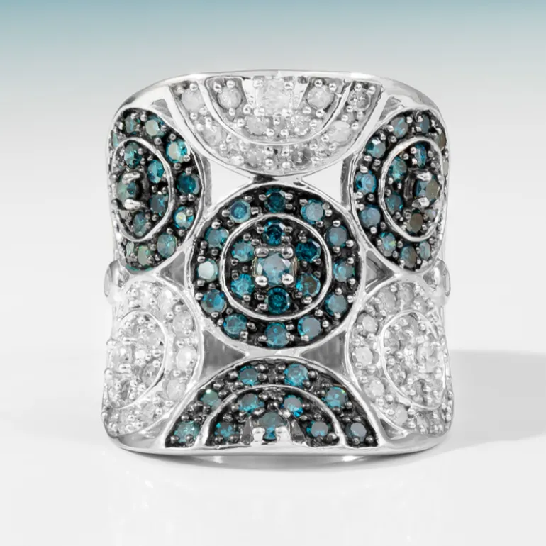 Tauchen Sie ein in die fesselnde Anziehungskraft dieses Rings aus Sterlingsilber, der mit 68 blauen Diamanten und 51 weißen Diamanten besetzt ist, die zusammen ein beeindruckendes Gesamtgewicht von 2 Karat ergeben. Das filigrane Design mit einer harmonischen Mischung aus Blau und Schimmern umschließt Ihren Finger mit einer luxuriösen Umarmung. Dieser Ring eignet sich perfekt, um einem kleinen schwarzen Kleid einen Farbtupfer zu verleihen oder ein legeres Ensemble aufzuwerten, und wird bei jeder Veranstaltung für Gesprächsstoff sorgen.