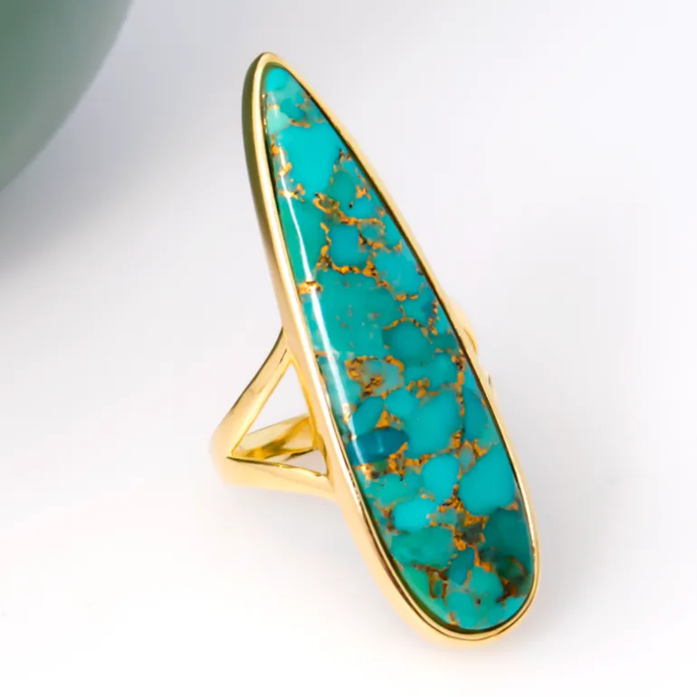 Dieser Ring aus vergoldetem 925er Sterlingsilber besticht durch einen tropfenförmigen Kupfertürkis von 9,82 Karat aus den USA. Sein 40×12 mm großer Cabochon-Schliff macht ihn zu einem auffälligen Schmuckstück. Der leuchtende Türkis mit kupferfarbener Matrix verleiht dem Ring einen Hauch von Eleganz und eignet sich sowohl für das tägliche Tragen als auch für besondere Anlässe. Kombinieren Sie ihn mit einer weißen Bluse für einen Farbakzent oder einem Abendkleid, um seinen goldenen Schimmer zu ergänzen.