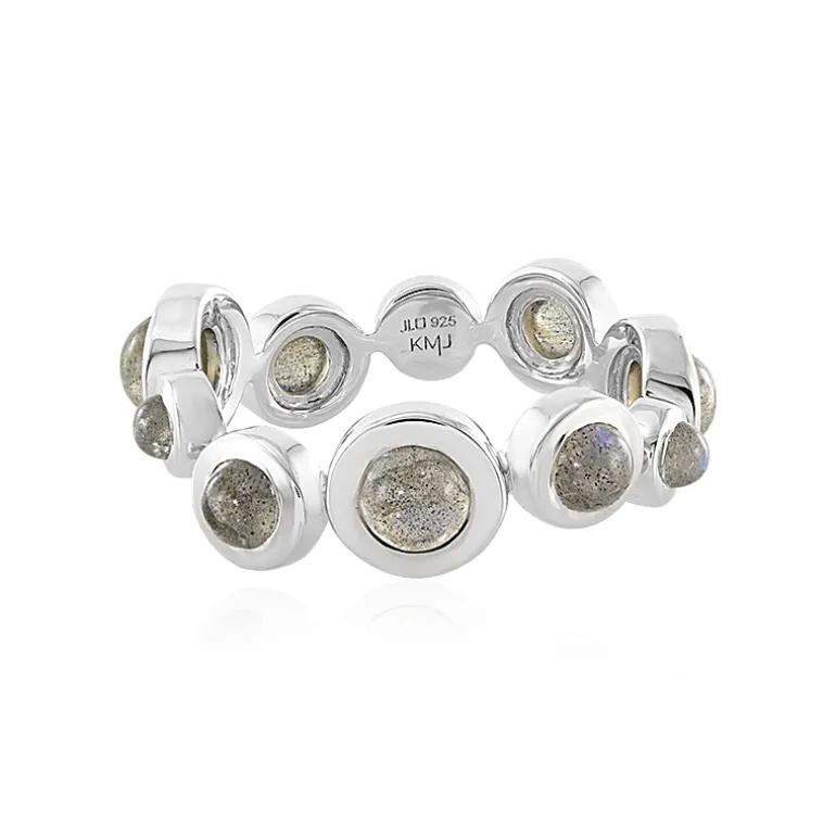 Entdecken Sie die bezaubernde Schönheit dieses Rings aus Sterlingsilber mit Labradoriten aus Madagaskar, ein Schatz aus der KM by Juwelo Kollektion. Mit einem Gesamtgewicht von mindestens 3,285 Karat besticht dieser Ring mit einer Reihe von runden Labradoriten in Cabochon-Form, die ein faszinierendes Farbenspiel bieten. Die Steine sind in hochwertigem 925er Sterlingsilber mit einem Mindestgewicht von 4,28 Gramm gefasst und sorgfältig angeordnet, um ein harmonisches Design zu schaffen. Dieser Ring eignet sich sowohl für lässige Eleganz als auch für anspruchsvolle Abendgarderobe und wertet jedes Outfit mit seinem einzigartigen Charme auf. Erhältlich in den Größen 17 und 18, ist er eine perfekte Mischung aus Haltbarkeit und Stil.