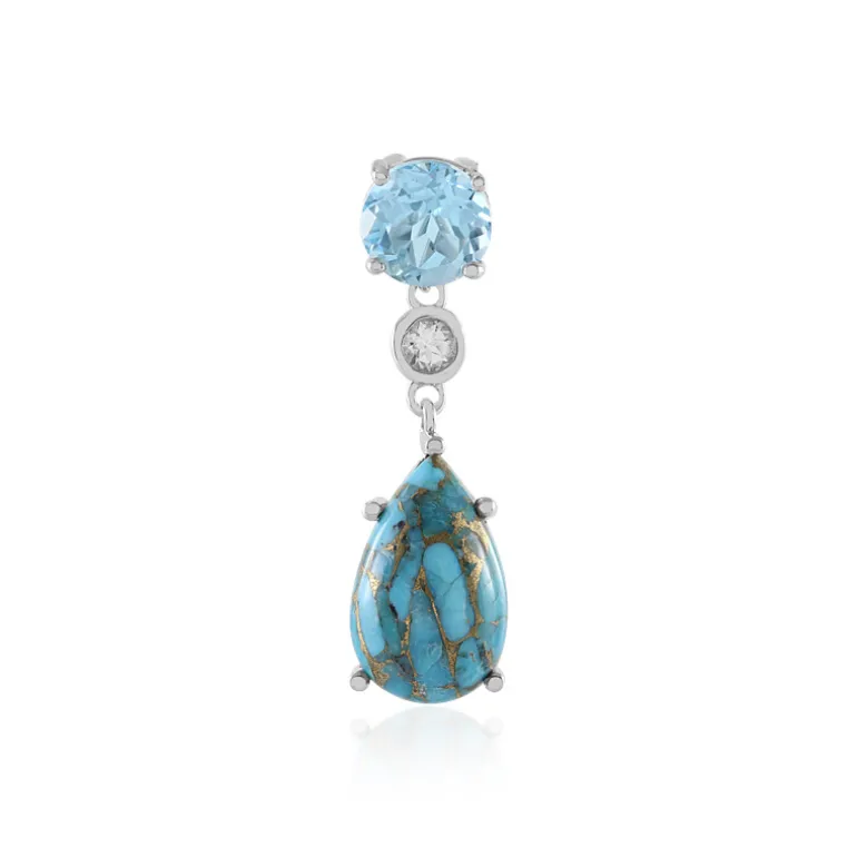 Entdecken Sie die heitere Schönheit dieses Anhängers mit einem faszinierenden Tropfen aus mohaveblauem Türkis, der durch das Funkeln von Himmels- und Weißtopas akzentuiert wird. Die Edelsteine stammen aus den USA bzw. Brasilien und sorgen dafür, dass der azurblaue Himmel und die perlweißen Wolken auch in Ihrer Garderobe zu sehen sind. Dieser Anhänger aus platiniertem 925er Sterlingsilber strahlt die kühle Eleganz eines modernen Erbstücks aus. Die Vielseitigkeit dieses Anhängers macht ihn zu einem Muss für Ihre Schmucksammlung. Er ist ideal, um einem kuscheligen Pullover einen Farbakzent zu verleihen oder ein formelles Abendkleid zu ergänzen.