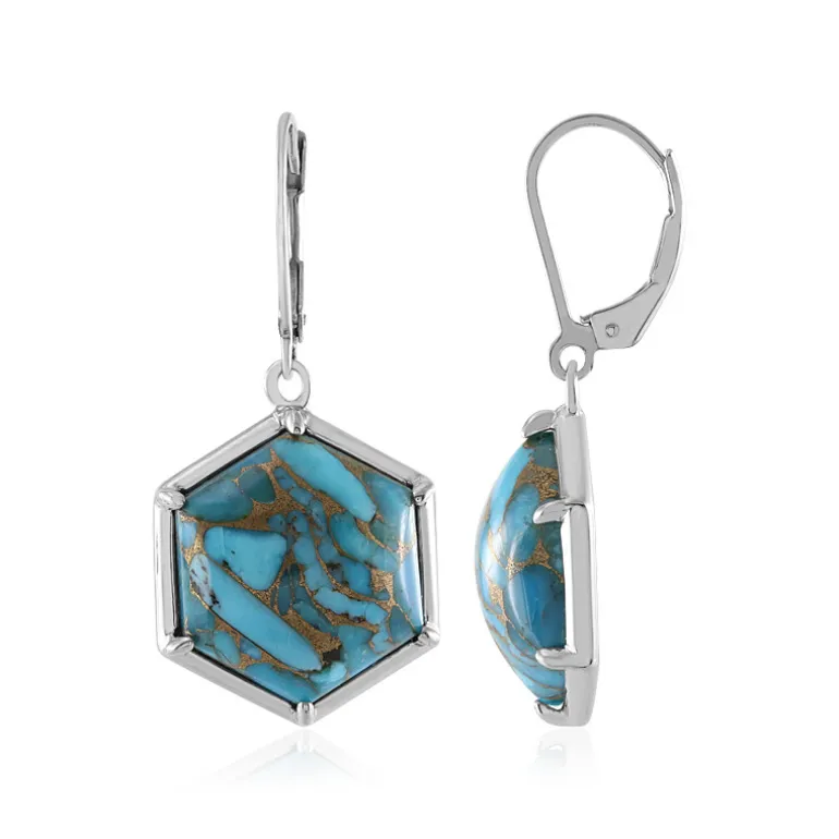 Umhüllen Sie Ihre Ohren mit den leuchtenden Farben des Wüstenhimmels mit diesen atemberaubenden hexagonförmigen Blue Mohave Turquoise Ohrringen. Jeder Ohrring weist ein einzigartiges Matrixmuster auf, das 20,34 Karat natürlicher Schönheit aus den USA verkörpert. Eingefasst in glänzendes, platiniertes 925er Sterlingsilber, bieten diese Schätze dauerhafte Eleganz. Diese Ohrringe sind ideal, um ein legeres Ensemble aufzuwerten oder der Abendgarderobe einen Hauch von Raffinesse zu verleihen. Sie sind vielseitig und für jeden Anlass geeignet.