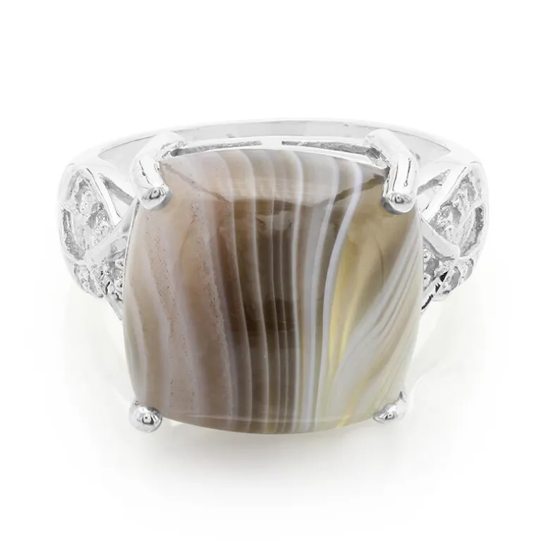 Entdecken Sie die erdige Eleganz dieses Achatrings aus Botswana, gekrönt von einem 7,92 Karat großen, antiken Cabochon, der natürlichen Charme versprüht. Eingebettet in 925er Sterlingsilber wird dieses Schmuckstück von funkelnden weißen Topasen aus Brasilien geschmückt, die dem majestätischen Mittelstück ein subtiles Glitzern verleihen. Die filigranen seitlichen Details aus Silber verstärken den Gesamteindruck und schaffen eine perfekte Verschmelzung von klassischem und modernem Stil. Dieser Ring ist eine vielseitige Ergänzung für jede Sammlung und eignet sich sowohl für legere als auch für formelle Anlässe.