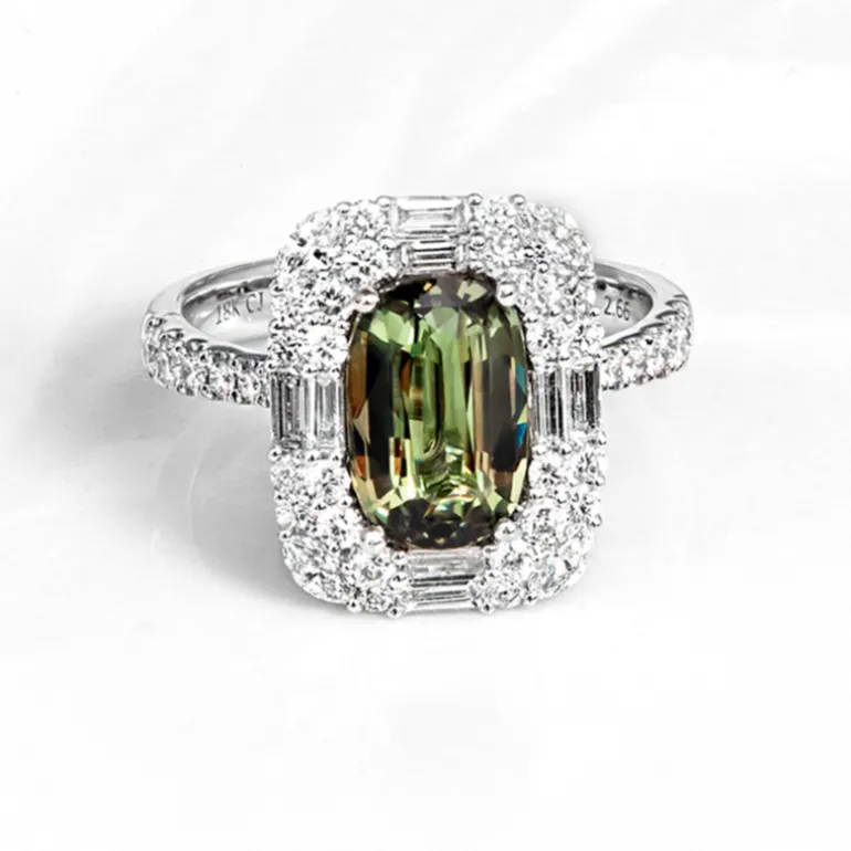 Entdecken Sie die Faszination dieses exquisiten Rings aus 750er Weißgold, der mit einem brasilianischen Alexandrit im Antikschliff von 2,66 Karat besticht. Eine Reihe von Diamanten im SI1- und SI2-Schliff im Marquise-, Baguette- und Rundschliff von insgesamt 1,04 Karat umgibt das Herzstück und verstärkt die Brillanz. Das elegante Design ist perfekt für besondere Anlässe und ergänzt mühelos die Abendgarderobe und verleiht Ihrem Ensemble einen Hauch von Raffinesse.