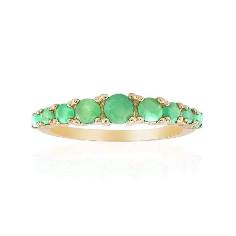 Entdecken Sie die üppige grüne Eleganz dieses Rings aus vergoldetem 925er Sterlingsilber mit einem Gesamtkaratgewicht von 0,591 Karat brasilianischer Smaragde. Die subtile Abstufung der Größe und der runde Schliff jedes Edelsteins betonen ihre natürliche Schönheit und machen ihn zu einer auffallenden Wahl sowohl für den Alltag als auch für besondere Anlässe. Kombinieren Sie ihn mit einer seidenen Bluse und einem Bleistiftrock für einen raffinierten Bürolook oder mit einem fließenden Kleid für einen Hauch von Abendglamour. Die Vielseitigkeit und Zeitlosigkeit dieses Rings machen ihn zu einem begehrten Schmuckstück in Ihrer Sammlung.