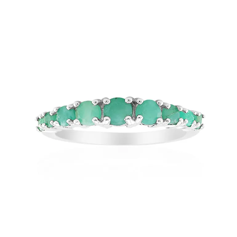 Entdecken Sie die üppige Anziehungskraft dieses brasilianischen Smaragdrings, der eine harmonische Anordnung funkelnder Smaragde in glänzendem 925er Sterlingsilber präsentiert. Dieser Ring mit einem Gesamtkaratgewicht von 0,591 ct verfügt über ein anmutiges Design, das einen zentralen 3,5 mm großen Smaragd im Rundschliff hervorhebt, der von etwas kleineren Edelsteinen flankiert wird, die sich elegant um den Finger schlingen. Der sanfte Glanz des Silbers ergänzt die lebendigen Grüntöne und macht dieses Band zu einem vielseitigen Schmuckstück, das sowohl für ein legeres Brunch als auch für formelle Anlässe geeignet ist. Erfreuen Sie sich an der lebendigen Hommage an brasilianische Edelsteine mit diesem Schmuckstück.