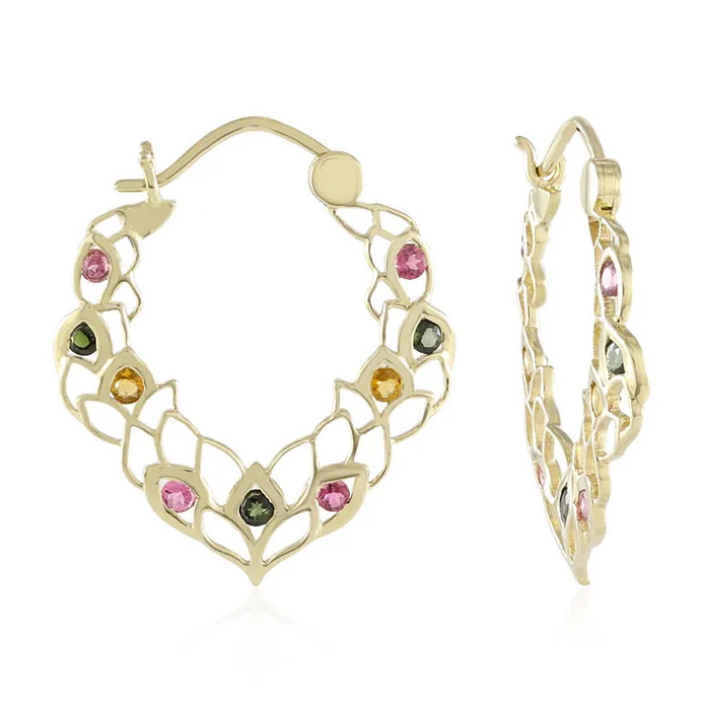 Entdecken Sie die Anziehungskraft dieser exquisiten Goldohrringe, die mit einer Reihe von brasilianischen Turmalinen besetzt sind. Sie sind aus 9 Karat Gelbgold gefertigt und zeigen rosa, grüne und gelbe Turmaline in einem fesselnden Design. Diese Ohrringe eignen sich sowohl für legere als auch für elegante Anlässe und verleihen jedem Outfit einen Hauch von Farbe. Kombinieren Sie sie mit einer klassischen goldenen Halskette oder einem Armband für einen stimmigen Look.