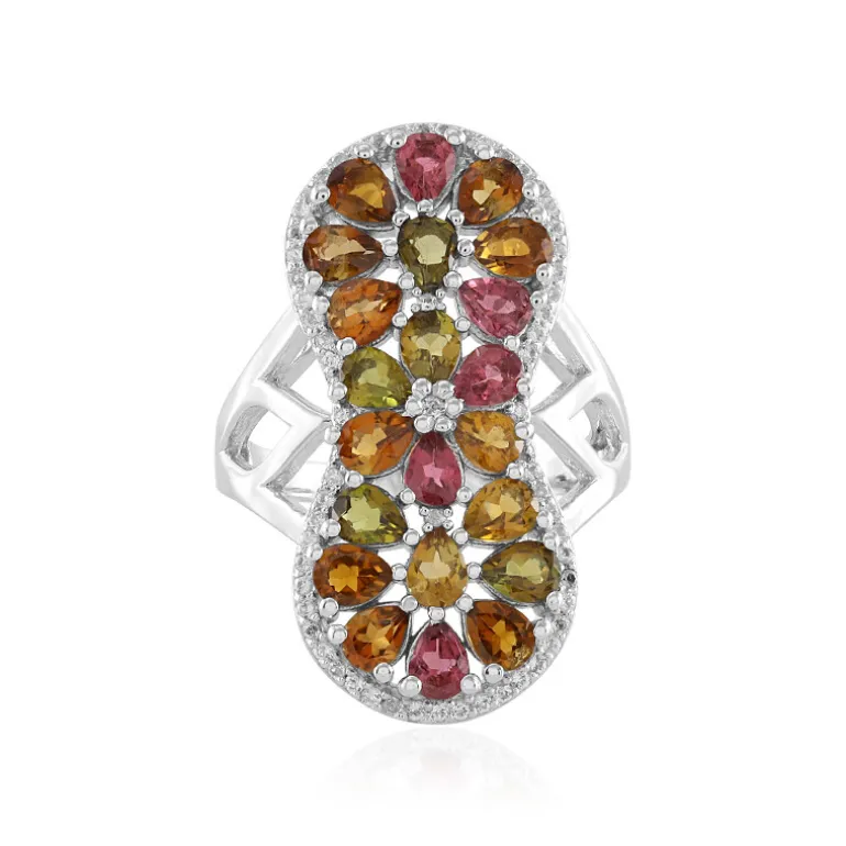 Treten Sie ein in eine Kaskade von Farben mit diesem lebhaften Multicolor brasilianischen Turmalin Silberring. Mit einer schillernden Auswahl an grünen, rosafarbenen, orangefarbenen, gelben und schokoladenfarbenen Turmalinen von insgesamt 3,087 Karat ist jeder Stein fachmännisch im Tropfenschliff geschliffen, um Brillanz und Farbton zu maximieren. Sie werden durch 63 funkelnde weiße Topase aus Indien ergänzt, die alle in 925er Sterlingsilber mit einem Gewicht von ca. 6,6 Gramm gefasst sind. Die Abmessungen von 24 x 21 mm machen dieses Schmuckstück zu einem auffälligen Accessoire, das jedem Ensemble einen Hauch von Eleganz verleiht. Dieser Ring ist ideal für besondere Anlässe oder als schickes Statement im Alltag und sorgt für Gesprächsstoff.
