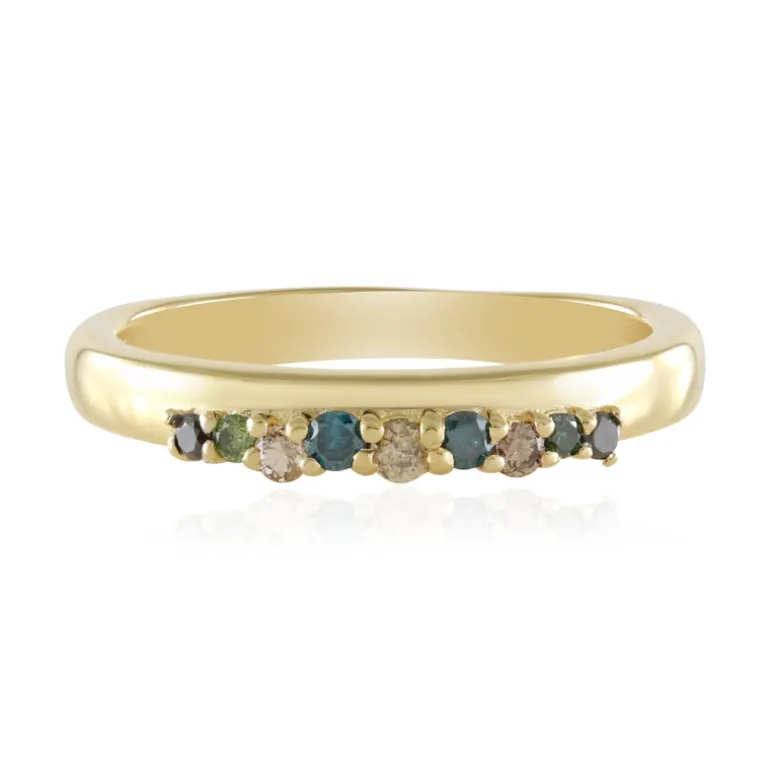 Entdecken Sie die Eleganz dieses exquisiten Rings mit einer atemberaubenden Reihe von schokoladenfarbenen, blauen, grünen und schwarzen Diamanten im Brillantschliff. Dieser Ring aus 925er Sterlingsilber mit vergoldetem Finish hat ein Gesamtkaratgewicht von 0,165 ct. Er eignet sich perfekt, um Ihrer Alltagskleidung einen Hauch von Luxus zu verleihen oder als Statement-Stück für besondere Anlässe. Kombinieren Sie ihn mit Ihrem Lieblingsabendkleid oder einem schicken Freizeitoutfit für einen raffinierten Look.