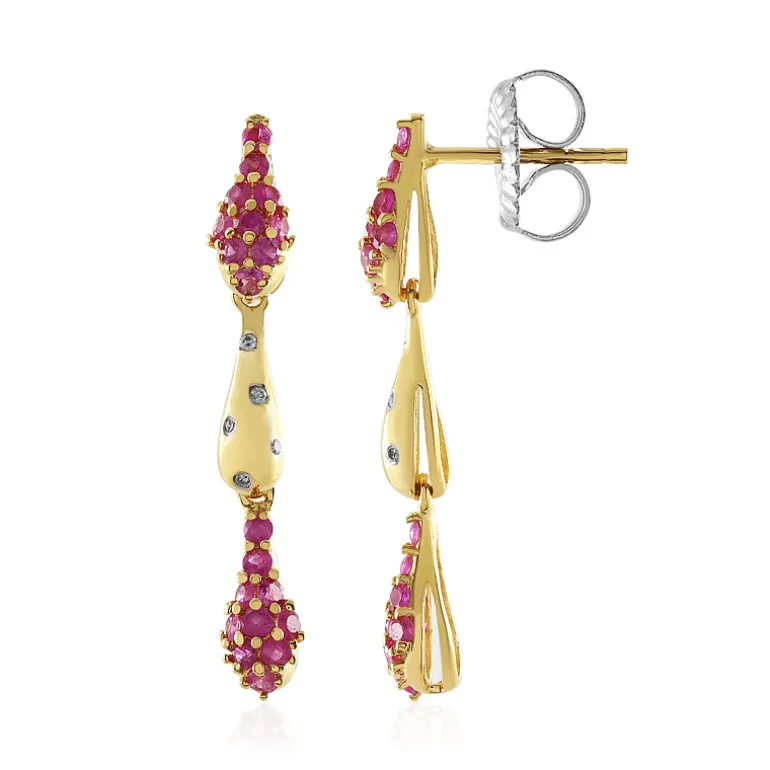 Diese Ohrringe aus vergoldetem 925er Sterlingsilber hüllen Ihre Ohren in die Pracht Myanmars. Sie präsentieren eine Kaskade von 40 birmanischen Rubinen im Rundschliff mit insgesamt 1,008 Karat. Verziert mit funkelnden Diamanten von 0,045 Karat, spiegelt dieses 32 mm große Paar die feurigen Farben eines bezaubernden Sonnenuntergangs wider. Perfekt, um Ihrer Abendgarderobe einen Hauch von Luxus zu verleihen oder ein Alltagsoutfit aufzuwerten.