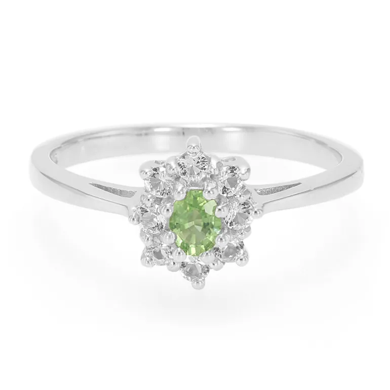 Dieser schimmernde Ring besteht aus einem ovalen Chromturmalin von 0,12 ct aus Tansania, eingebettet in einen funkelnden Heiligenschein aus 8 runden weißen Topasen im Brillantschliff von insgesamt 0,247 ct aus Brasilien. Der Ring ist fachmännisch aus 925er Sterlingsilber gefertigt und wiegt ungefähr 1,86 g. Das Design des Rings bietet einen atemberaubenden Kontrast zwischen dem leuchtend grünen Turmalin und den glitzernden Topasen. Er ist ideal, um Ihrem Ensemble einen Hauch von Farbe zu verleihen, und passt sowohl zu lässigen Tageslooks als auch zur Abendgarderobe, was ihn zu einer vielseitigen Ergänzung für jede Schmucksammlung macht.
