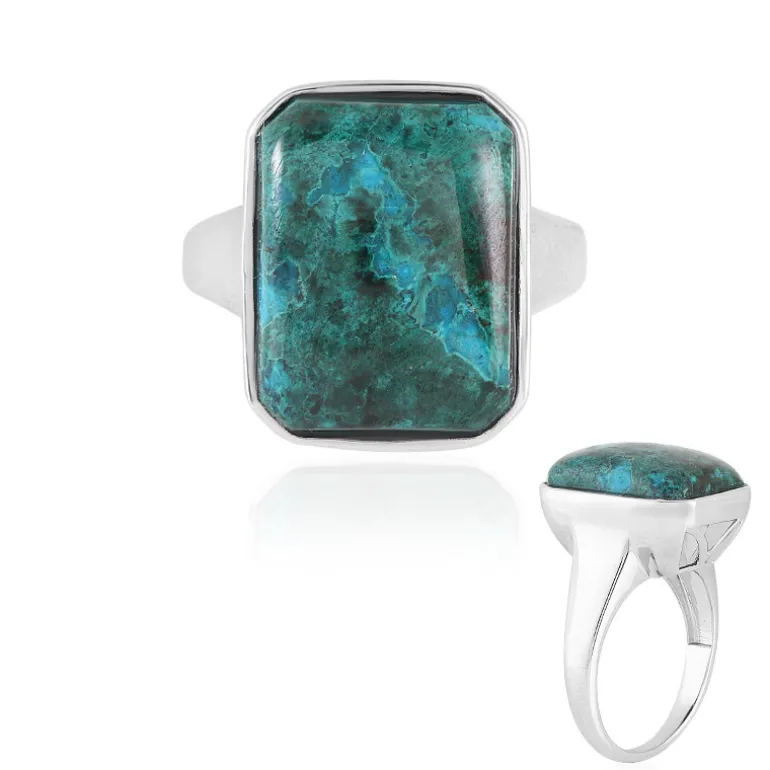 Mit einem beachtlichen 10,94 Karat schweren peruanischen Chrysokoll verkörpert dieser meisterhaft gearbeitete Herrenring Stärke und Raffinesse. Die tiefen Teal-Töne des Edelsteins werden durch das schlanke 925er Sterlingsilberband hervorgehoben. Als perfektes Statement-Stück für den Alltag oder besondere Anlässe ergänzt er mühelos einen Anzug oder ein Freizeitoutfit.