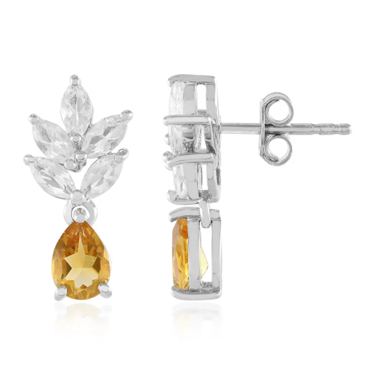 Diese atemberaubenden Ohrringe mit lebhaften brasilianischen Zitrinen und weißen Topasen sind in elegantes platiniertes Sterlingsilber gefasst. Die Tropfen- und Marquise-Schliffe bilden ein anmutiges Arrangement, das sich für jeden Anlass eignet. Tragen Sie sie, um einem lässigen Tagesausflug einen Hauch von Funkeln zu verleihen, oder kombinieren Sie sie mit einem eleganten Abendoutfit für einen wahrhaft raffinierten Look. Ein Muss für Edelsteinliebhaberinnen!