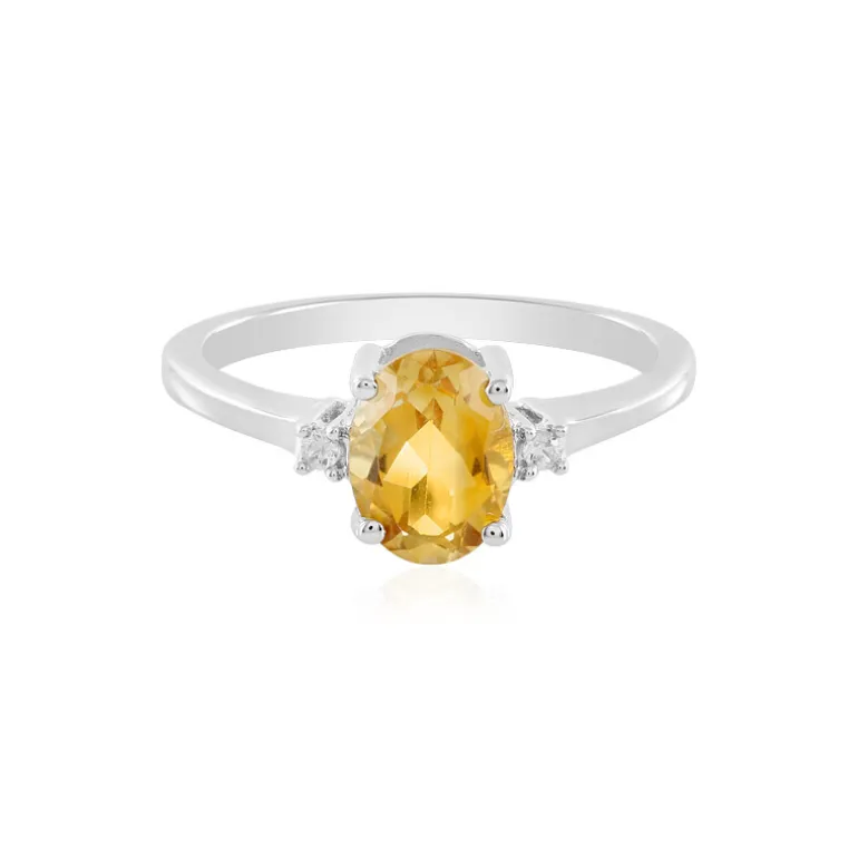 Entdecken Sie den sonnengeküssten Glanz unseres ovalen brasilianischen Citrins, der elegant von funkelnden Zirkonen in einem eleganten Ring aus platiniertem Sterlingsilber eingerahmt wird. Mit einem Edelsteingewicht von insgesamt 1,115 Karat strahlt dieses Schmuckstück die Wärme eines goldenen Sonnenuntergangs aus. Der ca. 8×6 mm große Citrin in der Mitte des Rings fängt die Lebendigkeit der brasilianischen Edelsteine ein, während die Zirkonsteine einen Hauch von glitzerndem Licht hinzufügen. Dieser Ring ist ideal, um einem legeren Ensemble einen Farbakzent zu verleihen oder ein Abendoutfit zu ergänzen.
