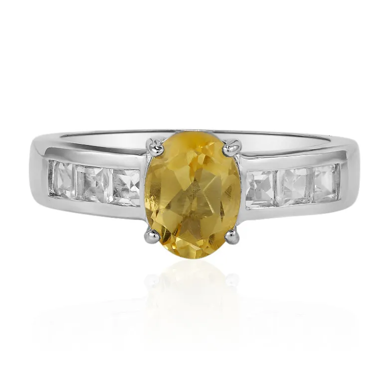 Dieser bezaubernde Ring präsentiert einen lebhaften brasilianischen Citrin mit 1,08 ct im Ovalschliff, flankiert von sechs makellosen weißen Topasen mit insgesamt 0,497 ct, die in eleganten Carré-Formen geschliffen sind. Das schlanke Design aus hochwertigem 925er Sterlingsilber strahlt sonnige Raffinesse aus. Kombinieren Sie diesen Ring mit einer strahlend weißen Bluse für einen eleganten Freizeitlook oder mit einem fließenden Abendkleid, um einem besonderen Anlass einen Hauch von Wärme zu verleihen.