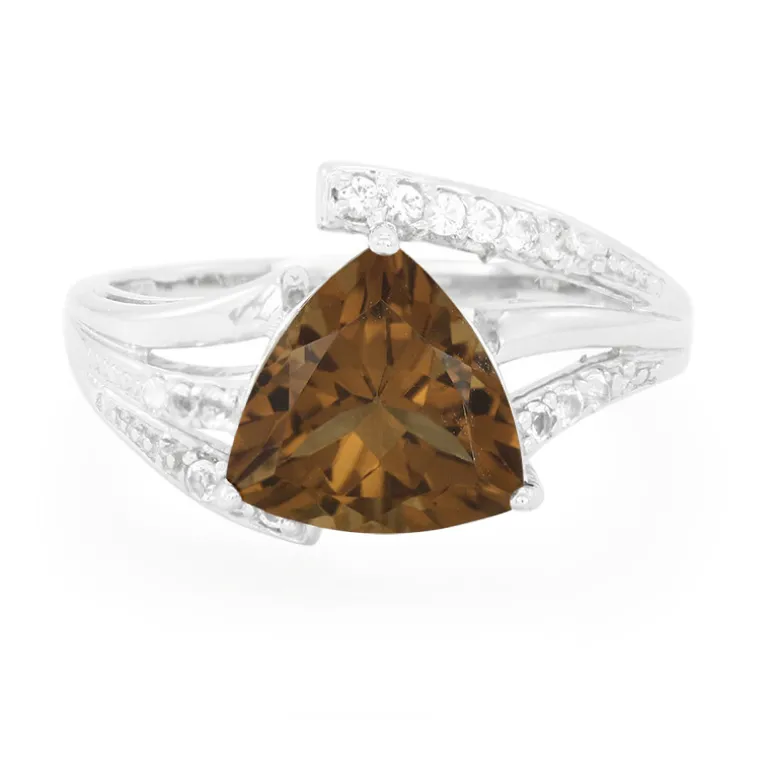 Schmücken Sie Ihre Hand mit diesem bezaubernden Ring aus Sterlingsilber, der einen brasilianischen Cognac-Quarz im Trillant-Schliff von 2,04 Karat in einem eleganten Design mit geteiltem Schaft präsentiert. Begleitet von fünfzehn glitzernden weißen Topasen von insgesamt 0,162 ct, verbindet dieses Stück modernen Chic mit klassischem Charme. Dieser Ring eignet sich perfekt, um jedem Ensemble einen Hauch von Wärme zu verleihen, und ist eine vielseitige Wahl sowohl für legere als auch für formelle Anlässe.