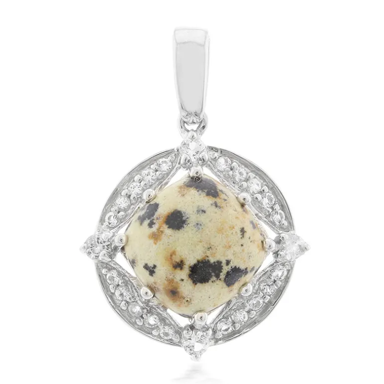 Dieser bezaubernde Anhänger trägt in der Mitte einen Dalmatiner-Jaspis von 7,67 Karat, der für seine einzigartige gefleckte Schönheit bekannt ist, die an den geliebten Hund erinnert. Der aus den USA stammende Edelstein ist meisterhaft in einen antiken, ca. 12 mm großen Kissen-Cabochon geschliffen und wird von einem strahlend weißen Topas aus Brasilien mit einem Gesamtgewicht von 0,65 ct umschlossen. Die Fassung aus 925er Sterlingsilber mit einem Gewicht von ca. 3,38 g bietet einen perfekten Hintergrund für die Steine, die einen auffälligen Kontrast bilden. Dieses Schmuckstück eignet sich für legere Ausflüge oder zum Aufpeppen von Bürokleidung und ist sicher eine vielseitige Ergänzung für jede Schmucksammlung.