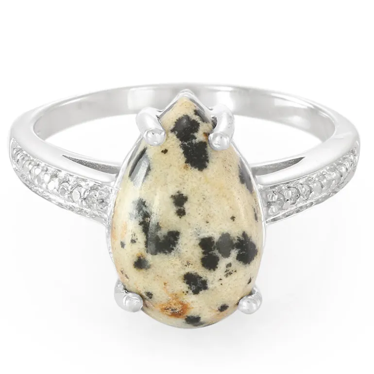 Entdecken Sie den einzigartigen Charme dieses schicken Dalmatiner-Jaspis-Silberrings mit einem 4,18-karätigen Edelstein aus den USA. Sein tropfenförmiger Cabochon-Schliff fängt die Essenz der Raffinesse ein, während der umlaufende kambodschanische Zirkon wunderschön funkelt. Dieser aus 925er Sterlingsilber geschmiedete Ring ist ein elegantes Statement für den Alltag oder besondere Anlässe. Kombinieren Sie ihn mit einfarbigen Outfits, damit das gesprenkelte Muster richtig zur Geltung kommt.