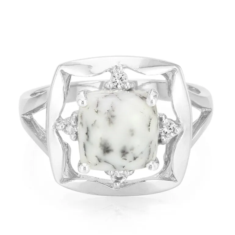 Enthüllen Sie die Kunstfertigkeit der Natur mit diesem raffinierten Ring aus 925er Sterlingsilber, der einen seltenen brasilianischen Dendritenachat von 2,08 Karat mit einem unverwechselbaren antiken Kissen-Cabochon-Schliff enthält. Akzentuiert von vier funkelnden weißen Topasen von insgesamt 0,101 Karat, strahlt dieses Stück Vintage-Charme aus. Die Mischung aus dem Glanz des Silbers und dem organischen Muster des Achats macht diesen Ring zu einem interessanten Gesprächsgegenstand für Sammler und zu einem auffälligen Accessoire für jedes Ensemble. Perfekt, um Ihr tägliches Outfit aufzuwerten oder besonderen Anlässen einen Hauch von Charakter zu verleihen.