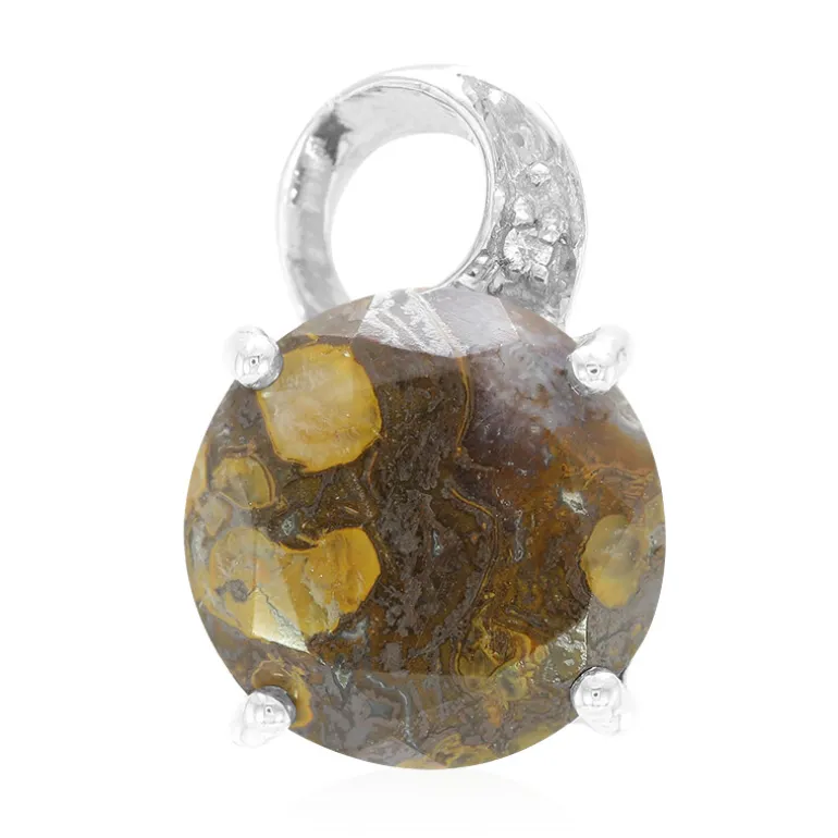 Entdecken Sie den prähistorischen Charme dieses einzigartig gestalteten Anhängers mit 2,87 Karat echtem Dinosaurierquarz aus den USA, der in eine faszinierende runde Form geschliffen wurde. Flankiert von funkelnden kambodschanischen Zirkon-Akzenten, ist dieses Schmuckstück kunstvoll in 925 Sterling Silber gefasst. Kombinieren Sie dieses Schmuckstück mit einer schlichten Bluse, um es im Alltag in den Mittelpunkt zu stellen, oder werten Sie ein Outfit für einen besonderen Anlass auf. Dieser Anhänger ist für Sammler und Stilliebhaber gleichermaßen geeignet und stellt eine zeitlose Ergänzung zu Ihrer Sammlung dar.