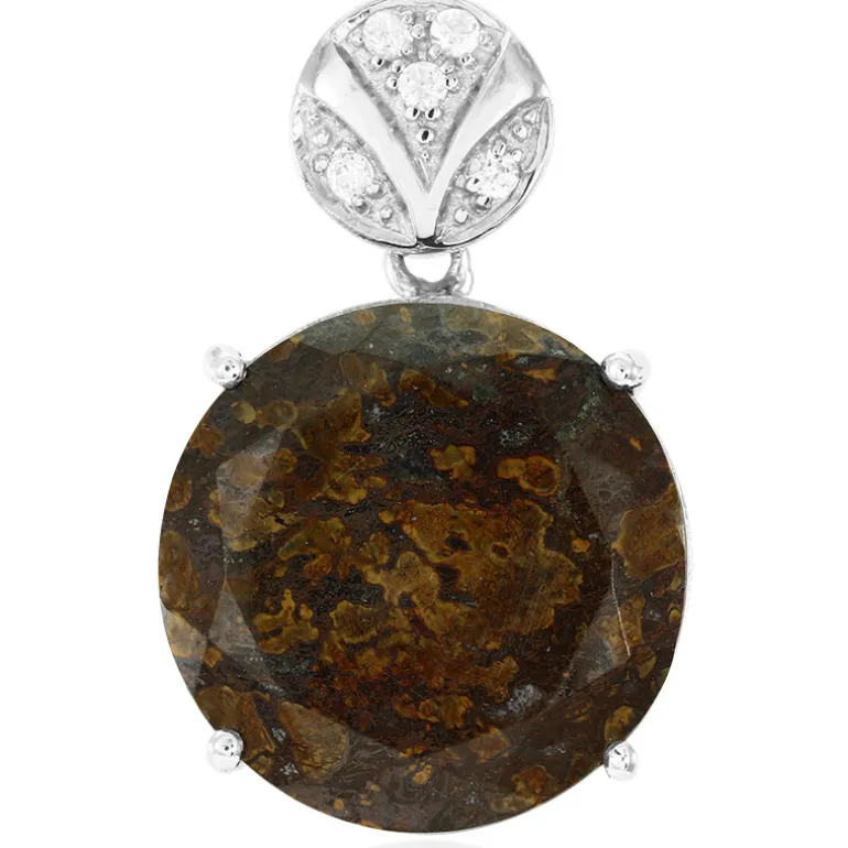 Entdecken Sie eine einzigartige Mischung aus Geschichte und Eleganz mit diesem Dinosaurierquarz-Anhänger aus den USA. Der 15,1-karätige Edelstein im Rundschliff wird von fünf funkelnden weißen Topas-Steinen aus Brasilien ergänzt, die seine Anziehungskraft noch verstärken. Der Anhänger ist aus 925er Sterlingsilber gefertigt und bietet einen zeitlosen Stil. Es eignet sich perfekt, um ein Statement zu lässiger oder formeller Kleidung zu setzen und ist somit ideal für jede Gelegenheit.